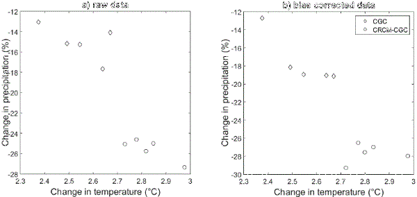 On the other hand, the climate change signal on temperature ranges from 2.3°C to 2.6°C for CGC, whereas for CRCM-CGC the CSS ranges from 2.7° to 2.9°. The CSS in temperature is not significantly changed after bias correction. Furthermore, results show that the climate change signal is larger for CRCM-CGC than for CGC for both meteorological variables.