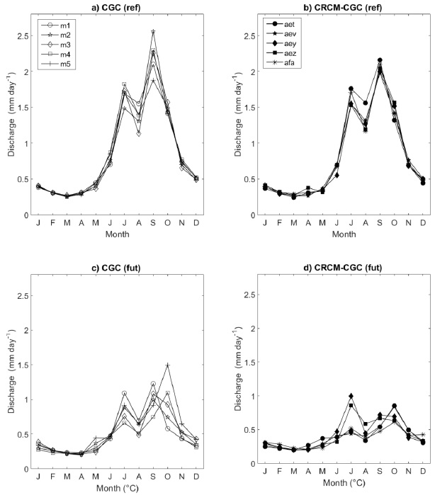 In the next step, GR4J was fed with bias corrected climate simulations in order to obtain streamflow simulations in reference and future periods. Figures 7a and 7b show the hydrological annual cycle in the reference period as simulated with CGC and CRCM-CGC, respectively. Both climate simulations reproduce the observed annual cycle as well as the midsummer drought. Regarding future period (Figure 7c and 7d), both types of climate simulations lead to a decrease on streamflow, especially CRCM-CGC. Moreover, the annual cycle in future period is somewhat modified, since October’s streamflow is higher that September’s streamflow for some simulations (e.g. aey and aez).