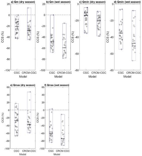 The simulated streamflow was used to compute the monthly hydrological indicators. Figure 8 shows the climate change signal on hydrological indicators evaluated for each member of the ensemble. The CCS was calculated over the same member; for example, the CCS for CGC member 1 was computed between member 1 in reference period and member 1 in future period. Such procedure leads to five CCS values for a given month and for a given hydrological indicator. Also, Figure 8 displays the CCS separated for the dry season (November to May) and for the wet season (June to October). The comparison of the median values in Figure 8 shows that, for all hydrological indicators, the CCS obtained with CRCM-CGC is larger than the CSS obtained with CGC. In addition, the decrease on hydrological indicators is larger for the wet season than for the dry season. For example, the median value of the CCS on Qm in the dry season (Figure 8a) is -21% and -28% for CGC and CRCM-CGC, respectively. Similarly, for the wet season (Figure 7b) the median CSS on Qm is -48% and -59% for CGC and CRCM-CGC, respectively. Comparing hydrological indicators, the most important decrease is estimated for Qmax in the wet season (Figure 7f), with values of -61% and -73% for CGC and CRCM-CGC, respectively.