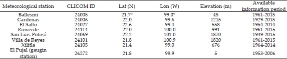 For this study, meteorological data from the stations depicted in Figure 2 were considered. The daily time series of precipitation and minimum and maximum temperature were obtained from the Climatologic Data Set (CLICOM, 2017) for the 1971-2000 period. The Tampaon River Basin has a mean annual temperature of 21.5⁰C and the area’s mean annual rainfall is 1080 mm. Table 1 shows the description of the hydro-meteorological stations considered in this study. The homogeneity of the precipitation data was evaluated with the Helmert test (e.g. Moreno et al., 2004). Results shows issues with station 24027; however, the station was retained, for the hydrological model efficiency was affected when such data were removed.
