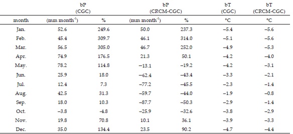 where and are the biases in temperature and precipitation, respectively; and are the observed variable values, and and are the simulated variable values. The temperature is expressed in °C and the precipitation in percentage (or in mm d-1 when no relative bias is considered).