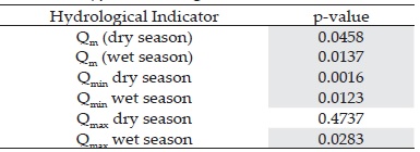 The Wilcoxon test (Wilcoxon, 1945) was used to compare the CCS on hydrological indicators obtained with CGC and CRCM-CGC. The null hypothesis is that two series of data are independent samples from identical distribution with equal medians (Wilks, 2006). Table 3 shows the result of the Wilcoxon test (p-value) performed to the series showed in Figure 8. In this table, it can be seen that the null hypothesis is rejected for all indicators, but for Qmax in the dry season (with a pvalue of 0.4737), for the CSS in precipitation is smaller in the dry season than in the wet season.