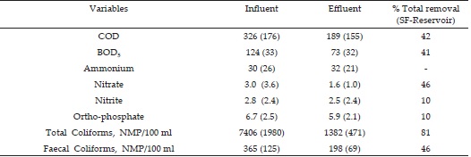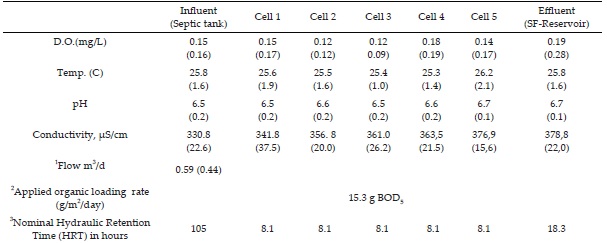 Water quality monitoring was carried out between October of 2009 and May of 2010. During the period December/09 to March/10, tomatoes were cultivated in the treatment cells. During the study, four (4) water samples were collected from each of the 5 treatment cells and four of influent and effluent. The average values were reported. All samples were preserved in an insulated cooler and temperatures were maintained at near 5ºC. Subsequently, and within 24 hours, the samples were analyzed for organic matter (COD, BOD5), ammonium nitrogen (NH4+-N), nitrate nitrogen (NO3−-N), nitrite nitrogen (NO2−-N) and ortho-phosphate (PO4−3-P) using methods as described in (APHA-AWWA-WEF, 2005). Water temperature, dissolved oxygen (DO), pH and conductivity measurements were obtained by monitoring the water within the vertical perforated PVC tubes (Figure 1). Measurements were taken at the midpoint of the water depth and water temperature, conductivity, pH and DO measurements were recorded with WTW 315i Set probes. Paired comparisons of inlet and outlet concentrations for each treatment cell were evaluated for COD, BOD5, (PO4−3-P), (NO3−-N), (NO2−-N) and (PO4−3-P).