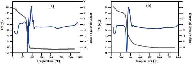 En la síntesis de las nanopartículas de Ni, se emplearon dos precursores químicos: etilenglicol y glicerol. Con el fin de establecer y seleccionar las temperaturas más bajas para sintetizarlas por el método Pechini. En ambos casos del uso de los precursores, se consideró la relación molar ácido cítrico/etilenglicol y ácido cítrico/glicerol: 1/4. Por separado, ambas relaciones se prepararon en 20 ml de agua desionizada a temperatura ambiente y, se agitaron en una parrilla magnética hasta disolver los sólidos. La mezcla se aforó a 60 ml y se calentó sin agitación magnética a 80°C para evaporar la solución y reducirla hasta 20 ml (Puente et al., 2012). Ambas soluciones se introdujeron en una mufla a 110°C por 24 h para obtener el gel. Posteriormente, las muestras de gel se evaluaron por separado en un equipo de calorimetría de barrido diferencial (DSC, por sus siglas en inglés) marca TA Instruments modelo Q600 empleando rampas de calentamiento 10°C/min de 25 a 1300°C para establecer la temperatura y pérdida de masa por calcinación.