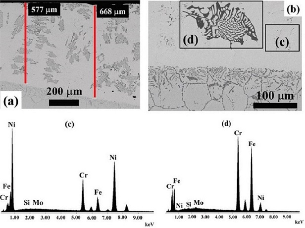 En otra sección del perfil transversal del recubrimiento de la muestra B atacada electroquímicamente, se muestran microestructuras eutécticas en forma de estructura laminar (Figuras 10a y b). Además, se aprecia una interface entre el metal base y el recubrimiento con precipitados. La composición química cualitativa de esta sección transversal, muestra por espectrogramas de área la composición química de elementos que evidencia que el recubrimiento es rico en Ni y las fases de aspecto laminar se componen principalmente de Ni, Fe y Cr (ver Figuras 10c y d). En la literatura se reporta que las fases de morfología laminar crecen a partir de reacciones invariantes eutécticas o peritécticas del sistema Ni-Cr-Fe (Ares et al., 2005; Rajasekhar et al., 1997; Kerr y Kurz, 1996).