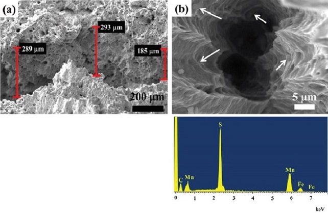 En la Figura 2 se observa la topografía de la fractura y las mediciones en el espaciamiento de la microgieta. Se aprecia por microscopía electrónica de barrido una superficie con microporos y microgrietas. Las microgrietas tienen anchos de 185 a 293 µm. Se resalta que la variedad de tamaños de los microporos alcanzan dimensiones menores a 1 μm y, en el interior se aprecian partículas ovaladas de naturaleza química elemental de Mn, S y Fe que deduce el MnS, principalmente (Figura 2b). Cabe mencionar que la solución preparada por el método Pechini se introduzce en los microporos y microgrietas y, en la tapa del tratamiento térmico se sellan y crece un recubrimiento metálico rico en níquel sobre la superficie de fractura.