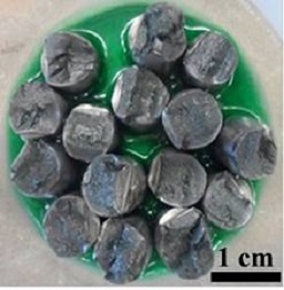 Resumen: En este estudio se llevó a cabo el crecimiento de recubrimientos ricos en Ni por el método Pechini sobre fracturas de acero inoxidable 304, para sanar superficies de fractura de piezas metálicas. Una serie de pruebas se llevaron a cabo para establecer la temperatura de calcinación por calorimetría de barrido diferencial (DSC) a 1300°C por 10°C/min en mezclas de (CH3COO)2Ni•4H2O (acetato de níquel tetrahidratado) con HOC(COOH)(CH2COOH)2•H2O (ácido cítrico monohidratado) y precursores: HOCH2CHOHCH2OH (glicerol) y HOCH2CH2OH (etilenglicol). Los resultados mostraron que el uso de Etilenglicol es mejor que el Glicerol debido a que muestra una estabilidad térmica a menor temperatura para la calcinación. Posteriormente, fracturas cilíndricas de 0.6 x 1 cm de acero inoxidable 304 se sumergieron en una solución con Etilenglicol y, se gelaron en una mufla a 110°C por 24 h. Adicionalmente, las muestras se calcinaron a 660°C por 60 min bajo un flujo de 200 ml/ min de Ar, a velocidad de calentamiento/enfriamiento de 5°C/min para sintetizar las nanopartículas de Ni sobre las fracturas. El crecimiento del recubrimiento sobre las fracturas se llevó a cabo en un flujo de Ar de 220 ml/min a 1100°C por 60 min a una velocidad de calentamiento/enfriamiento de 10°C/min. Mediante microscopía óptica y de barrido, se observó que el recubrimiento presenta un espesor de hasta 700 μm con una serie de precipitados cuboidales mayores a 1 μm, así como fases laminares ricos en Ni, Fe y Cr.