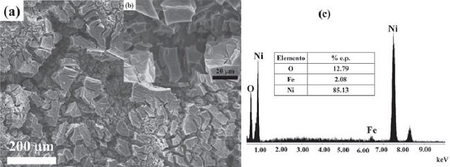 Las Figuras 4a y b muestran una zona de la topografía y el análisis puntual químico de la cubierta de gel calcinado a 450°C por 1 h. Los microporos están totalmente cubiertos por el material calcinado rico en elementos de Ni y, en menor proporción de O y Fe. Se considera que cierta cantidad de níquel se oxida a 1000°C debido a la presencia de O en la solución previa a la calcinación. La factibilidad de la formación de nanopartículas Ni/NiO en el rango de 450-660°C es confirmado en la literatura (Puente et al., 2012). Estos tamaños nanométricos modifican las propiedades físicas del material que permiten una alta reactividad química con el substrato.