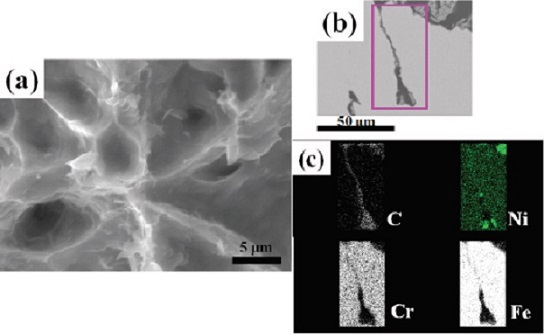 La Figura 5a, b y c muestran a altas amplificaciones otra zona por MEB de la fractura calcinada a 450°C por 60 min bajo un flujo Ar. La superficie de la fractura frontal muestra que los microporos están completamente cubiertos por material calcinado (Figura 5a). Por otro lado, se aprecia por mapeo en el interior de la microfisura la composición química elemental rico en Ni y C (Figura 5b y c). El contenido de C se forma durante la etapa de calcinación debido a que el material empleado por el método Pechini es de origen orgánico.