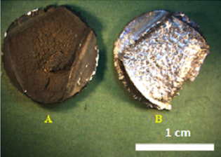 Cabe señalar que el recubrimiento de las muestras se caracterizó estereoscópicamente para elegir 2 muestras representativas de la serie de experimentos de la Tabla 2. En la Figura 6 se aprecia en la muestra A, una superficie de fractura opaca en color café y pequeñas partículas en tonalidad clara. Evidentemente, el crecimiento del recubrimiento no se obtiene a 1000°C por 30 min. En contraste, la muestra B observa un recubrimiento de aspecto metálico sin evidenciar las discontinuidades en la fractura. Las condiciones del tratamiento térmico a 1000°C por 60 min permite que las nanopartículas obtenidas por calcinación sean suficientemente reactivas con el metal base y coadyuven a la formación del recubrimiento. No hay una explicación clara hasta el momento de qué origina la formación del recubrimiento. Sin embargo, se póstula que se forma una fase líquida transitoria.