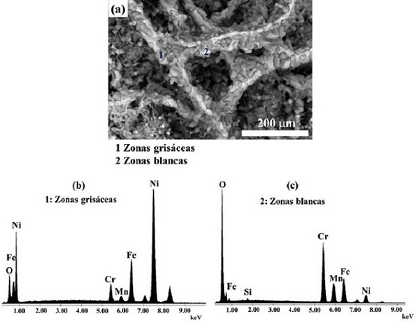 La Figura 7a muestra la imagen del crecimiento incompleto del recubrimiento sobre la superficie de fractura de la muestra A tratada térmicamente a 1000°C por 30 min empleando una velocidad de calentamiento de 10°C/min. Se aprecian zonas blancas del recubrimiento incompleto y zonas de color grisáceo mediante la técnica de electrones dispersados en el microscopio electrónico de barrido. Estas formaciones de compuestos se favorecen en las crestas de los microporos debido a una mayor energía superficial. Los espectrogramas de la Figura 7b y c muestran la naturaleza química de la zona grisácea (1) y blanca (2) analizada por la técnica de energía dispersiva de rayos-X. La Figura 7b muestra la composición química de las zonas grisáceas con picos intensos de níquel (Ni) y picos menos intensos de oxigeno (O), hierro (Fe) y cromo (Cr), así como picos de menor intensidad de Mn. Mientras tanto, las zonas en tonalidad blanca (2) muestran un pico intenso de oxígeno (O) y cromo (Cr), además de los elementos propios de la aleación (Figura 7c). Se establece que corresponden a óxidos de cromo.