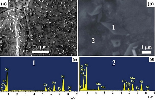Posteriormente, se realizó el mismo procedimiento para la muestra B a una temperatura de 1000°C por 60 min, empleando una velocidad de calentamiento de 5°C/min. En la Figura 8a se muestra sobre el recubrimiento una distribución de partículas de tamaños mayores a 1μm, así como partículas de morfologías cuboidal de color blanco y grises. Cabe mencionar que la formación de estas partículas crecen a partir de la nucleación y crecimiento de las nanopartículas de níquel sobre defectos y el mismo substrato que está compuesto principalmente de Cr, Fe y Ni. Básicamente, las partículas de aspecto cuboidal (zona 1) tienen un aspecto laminar con una composición química rica en Ni con Fe y Cr, principalmente (Figuras 8b y c). Los análisis químicos puntuales sobre la matriz del recubrimiento (zona 2) por EDX muestran picos intensos de níquel (Ni) y picos de mediana intensidad de los elementos químicos de hierro (Fe) y cromo (Cr), así como picos de menor intensidad de carbono (C), molibdeno (Mo) y manganeso (Mn) que corresponden a la composición química del substrato y el carbono proveniente de la etapa de calcinación (Figuras 8b y d).