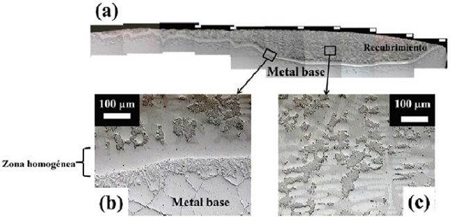 La Figura 9a muestra un mapeo metalográfico de un corte transversal del recubrimiento en condición de pulido con espesor de entre 50 a 700 µm a lo largo de la superficie de fractura. A altas amplificaciones se aprecia la interface (metal base-recubrimiento) y la zona del recubrimiento con una microestructura dendrítica (Figuras 9b y 9c). Las microestructuras dendríticas indican la formación de fases líquidas transitorias antes del crecimiento del recubrimiento (Cook y Sorensen, 2011; Kerr y Kurz,1996). Se postula que en la superficie se tiene la fase líquida en contacto con el metal base y, se transfiere calor del sólido al líquido (gradiente térmico negativo) e inicia la transferencia de especies químicas a la fase líquida, que permiten por nucleación, formar mayor fracción sólida. Cabe mencionar que en la etapa de la difusión se forma un volumen de líquido entre la intercara del metal base, obteniéndose una composición química diferente a la inicial. Por lo tanto, se forman dos regiones con diferentes concentraciones de soluto disueltos en la fase líquida que aumenta en espesor, mientras la intercara sólida va disminuyendo. En consecuencia, con el tiempo se obtendrá una única fase líquida de composición rica en Ni (CL) con sus respectivos gradientes de concentración de Fe, Cr y Mn, principalmente. Por lo tanto, una vez que la capa líquida está en contacto con el metal base, inicia una difusión rápida de los elementos que difunden del líquido al sólido y los del metal base, hacía el líquido, hasta alcanzar un gradiente de concentración homogéneo en la fase líquida. La tasa de transferencia de especies químicas es una función de los gradientes de concentración en ambas capas. En cuanto inicia la solidificación, la difusión toma un proceso lento y la homogeneización química depende del tiempo, en este trabajo de investigación la zona homogénea es ~ 100 μm (Figura 9b).