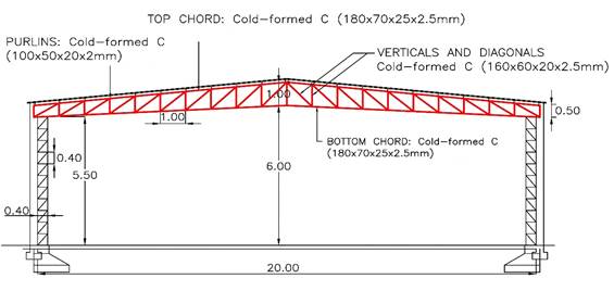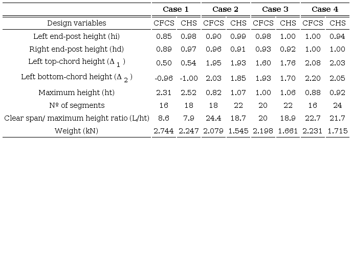 Weights indicated in Table 3 refer to the full optimization, bar to bar, which for Case 1 (CFCS) leads to 8 different profiles, meaning a weight reduction close to 39 %. In practice, this presents drawbacks at the moment of constructing the truss, either due to difficulties in the assembly between one bar and the other, or because of the increase in the cost of labor. Normally, in these circumstances, the sections in chords, verticals, and diagonals are homogenized to gain constructive simplification. In this situation, adopting 4 different sections for the CFSC profile (one of them for the top chord, one for the bottom chord, one for both left and right end posts, and the fourth one for the rest of the inside members), for the cited variant that is compared, the reduction will be close to 25 %.