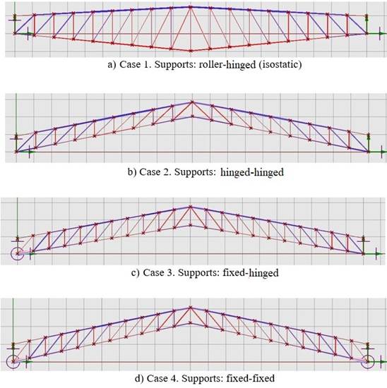 Figure 8 shows schematically, and for comparative purposes, the external shape that the optimized truss takes depending on the type of external supports with which it is modeled. As it can be seen, there is a qualitative leap in the configuration when going from the isostatic case (Figure 8a) to the hyperstatic case since one additional restriction is incorporated (Figure 8b). This external form, substantially, does not change in the remaining two cases (Figures 8c and 8d). Likewise, from Table 3 it appears that the weight decreases significantly in the hyperstatic cases, being Case 2 (hinged-hinged supports) the one which leads to the lighter structure.