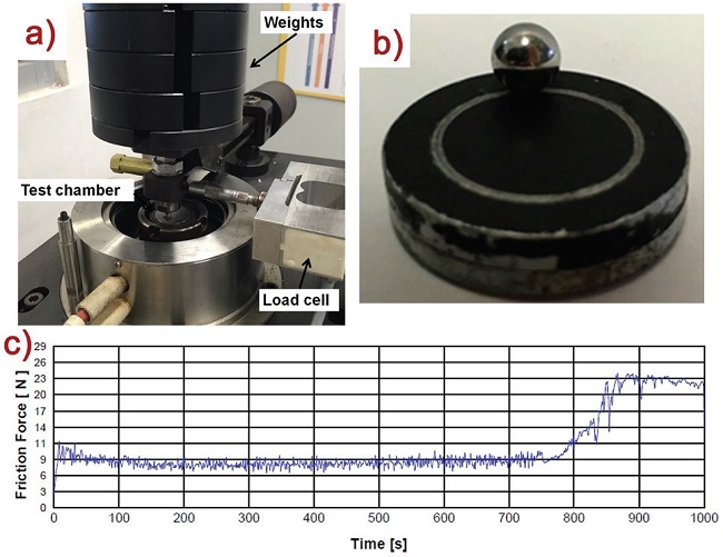 Tribological properties of nanocomposite coatings were determined with a ball-on-disk tribotester (Figure 2a), under ASTM G-99, to determine the wear resistance with an accelerated test under point contact conditions. Here, the coatings are subjected to a load of 25 N, speed of 238 rpm, over a total distance of 100 m and wear track diameter of 16 mm (Figure 2b). With this method an increase in the friction force is observed when the coating layer breaks, and thus the duration of the coating is obtained. Higher duration and wear resistance of coatings is beneficial for delaying corrosion initiation. Figure 2c shows the friction force through time; it could be seen that at 750 s, the coating layer is broken, and friction force increases.