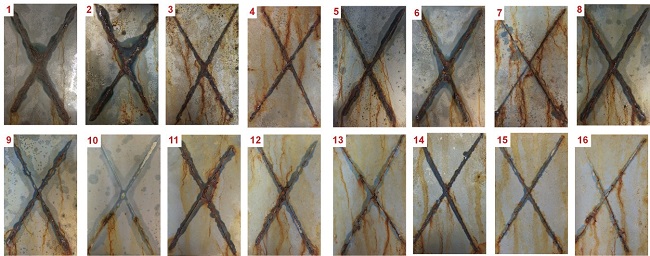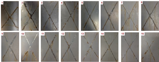 Figure 3 shows the general appearance of scribed coated steel surfaces prior to the salt spray test. Images of samples after exposure for 96 h, and 480 h are shown in Figure 4 and Figure 5, respectively.