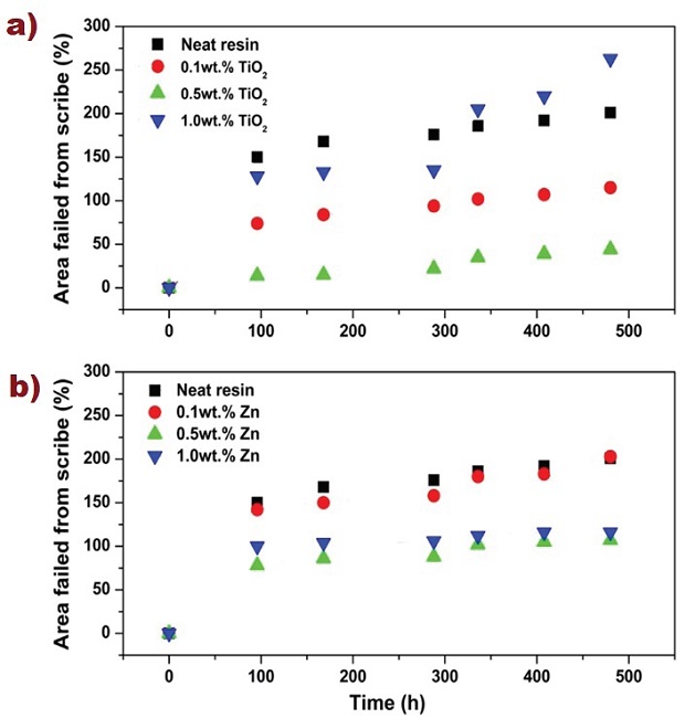 Figure 6 and Figure 7 depict the growth of the corroded area with respect to the scribed mark obtained through image analysis performed with 2D CAD system, in accordance to ASTM D-7087. Images were taken and analyzed at 96, 168, 288, 336, 408, and 480 h, and compared to the neat resin coating. The epoxy vinyl ester resin presented a rapid increase in corroded area (150 %) after 96 h of exposure, after which the increase was lower. At 480 h the neat resin had an increase of 200 %, whereas all nanoparticle concentrations and mixtures showed better corrosion protection. In Figure 6 results showed an increasing corrosion protection rate up to 0.5wt.%, after which a reverse trend was present, most likely due to filler agglomeration, particularly for TiO2, as has been observed from previous research and work in our group (Peña et al., 2014, 2015, 2016). In general, this nanoparticle showed better performance compared to Zn. For instance, at 0.1 and 0.5 wt. % TiO2 (Figure 6a) had a lower increase of corroded area at 480 h; 115 % and 44 %, respectively. This could be attributed to increased barrier properties against oxygen and water (Chen et al., 2006; Deyab & Keera, 2014), and due to filling the coatings’ pores and voids (Moazeni et al., 2013). The observed increase at 1.0 wt. % TiO2 after 288 hrs under corrosion evaluation could be attributed to certain tendency of the nanoparticles to agglomerate, due to filler fraction, and form clusters, which diminished the protection in the coating. Zn nanoparticles (Figure 6b) showed a rapid increase on corroded area after 96 h, similar to the neat resin, and an increase on area failed from scribe of ~200 %, 107 %, and 116 % at 0.1, 0.5, and 1.0 wt. %, respectively at the end of the test.