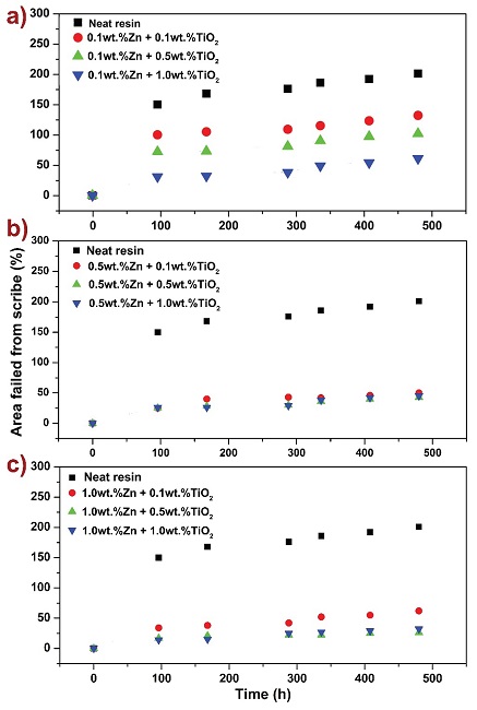 A synergistic effect was observed when both Zn and TiO2 nanoparticles were incorporated into the epoxy vinyl ester resin (Figure 7). At a fixed concentration of 0.10 wt. % Zn (Figure 7a) the corroded area was lower with higher TiO2 content; 31 % and 61 %, at 96 h and 480 h, respectively. An increased corrosion protection was found at a fixed 0.5 wt.% concentration of Zn (Figure 7b), where increase of ~ 26 % where found at 96 h exposure, and up to ~ 50 % increase was observed at 480 h, with increasing TiO2 filler fraction. Similar trends are observed at 1.0 wt. % Zn nanocomposite (Figure 7c); here the lowest corroded area was found with 0.5 wt. % TiO2, starting at 14 % and ending at 26 %. Thus, the best protection was observed for coatings with mixtures of 1.0 wt. % Zn and 0.5 wt. % TiO2.