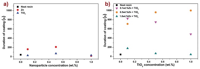 Ball-on-disk tribotester was used for evaluations of tribological performance. Figure 8 depicts the synergistic effect of nanoparticle filler fraction and the coating duration under a constant load of 25 N. This result is determined when the coating breaks and the friction force increases, as shown in Figure 2c. Figure 8a shows that duration of the coating is improved with Zn and TiO2 nanoparticles with up to 0.5 wt. % up to 211 s, compared to 43 s for the unfilled polymer coating. When both nanoparticles are combined (Figure 8b) the duration increases up to 1000 s, with an improvement greater than 2000 %, compared to the pure epoxy vinyl ester polymer resin.