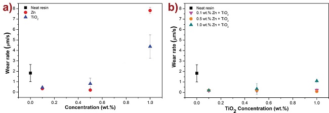 Figure 9 shows the depth wear rate in µm/s obtained taking the displacement of the tribosystem that occurs in the z-axis (perpendicular to the disk surface) measured by the equipment and dividing it by the duration of the coating. For instance, in Figure 9a both Zn and TiO2 nanocomposites showed a decrease in depth wear rate compared to the neat resin with concentrations of 0.1 wt. % and 0.5 wt. %. The lowest wear rate, with a reduction of 89 %, is found for 0.5 wt. % Zn %. These enhancements can be explained as follows: it has been proposed that during the wear process nanoparticles could be slightly detached from the polymer matrix and provide a rolling bearing effect, enhancing the protection to the polymer nanocomposite coating (Friedrich & Schlarb, 2011). Furthermore, hardness of polymer nanocomposites increases with nanoparticle content, also lowering wear (Chen et al., 2006; Lingaraju et al., 2011; Zhi et al., 2001). However, at higher concentrations of Zn and TiO2 nanocomposites (1.0 wt. %) the wear rate increases, hence, the time for oxide to appear (layer duration). This may be due to nanoparticle agglomeration in the matrix. In Figure 9b, where 0.1 wt. %, 0.5 wt. %, and 1.0 wt. % Zn nanocomposite coatings were prepared with varying concentrations of TiO2; it was observed that all combinations decreased depth wear rate demonstrating a synergistic effect between the selected nanoparticles with improvements up to 95 %. Consistent with Wang´s study (Wang et al., 2010b), it is proposed that the small sized TiO2 aid in the filling of pores and voids of the matrix providing a load-bearing effect, whilst Zn nanoparticles provide a rolling-bearing effect, thus further reducing wear rate of polymer nanocomposites