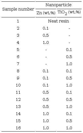 Steel substrates of an AISI 1045 steel measuring 150 mm by 100 mm with 2.0 mm in thickness were sanded and washed with acetone to remove any rust and dirt from the surface. Next, surfaces were sanded with 220-grit sandpaper to an Ra of 0.48 µm. Nanocomposite coatings at various concentrations and combinations of Zn and TiO2 nanoparticles within an epoxy vinyl ester resin were prepared as shown in Table 1. This resin is widely used for coatings and as a matrix for composite materials. In order to break large agglomerates, nanoparticles were first dispersed in the neat resin using an Ultra Turraz T10 homogenizer for 5 min, followed by 2 min sonication with a Cole-Parmer 750-Watt ultrasonic homogenizer at room temperature (25 °C). Then, 0.05 parts per hundred (phr) of Cobalt Napthenate 6 % and 1.00 phr of methyl ethyl ketone peroxide (MEKP) catalyst were added to the resin mixtures in order to harden the composite. Curing time of resin was 30 ± 10 min at 35 °C. Lastly, polymer nanocoatings were uniformly applied with a brush and allowed to cure for 24 h. The thickness of coatings was 150 µm, measured by an Elcometer 456 coating thickness gauge.