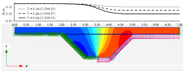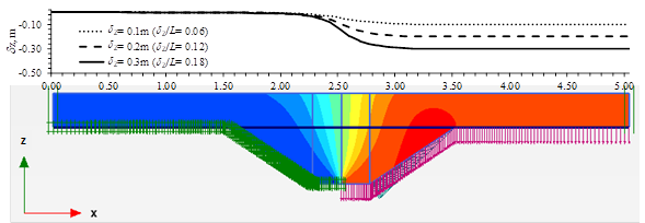 De los resultados de los análisis, se graficaron los desplazamientos verticales en la superficie de la caja para las tres condiciones de frontera (δz = 0.1, 0.2 y 0.3 m) y para las dos profundidades del dentellón (0.50 m y 1.00 m). Las Figuras 9 y 10, muestran los resultados de la influencia de la profundidad del dentellón sobre la distancia horizontal L en la superficie en la que se distribuyen los asentamientos diferenciales. Por ejemplo, cuando se tiene un desplazamiento δz = 0.1 m, la deformación unitaria en la superficie es δz/L = 0.06 y δz/L = 0.03, para 0.5 m y 1.0 m de profundidad del dentellón, respectivamente. Se observa que los asentamientos diferenciales superficiales se distribuyen en una longitud de 1.6 m para el dentellón de 0.5 m de profundidad, mientras que para el de 1.0 m la longitud es de 3.0 m. A mayor profundidad de la caja de arena, es menor δz/L en la superficie. Por lo tanto, la eficiencia de la caja es una función de la profundidad de la misma. Asimismo, se observa que las distancias horizontales L donde se disipa el asentamiento, son similares con las obtenidas con los análisis de elemento discreto, las cuales son de 1.70 m y 3.60 m para para 0.5 m y 1.0 m de profundidad del dentellón.