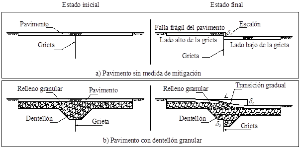 Para mitigar los problemas en las vialidades asociados a grietas con escalón, se propone la colocación de un dentellón granular en la superficie del suelo. Esta idea se sustenta en que los materiales granulares, como la arena, no transmiten tensiones y sus partículas constitutivas pueden cambiar sus posiciones relativas dentro del medio adaptándose a los movimientos externos.