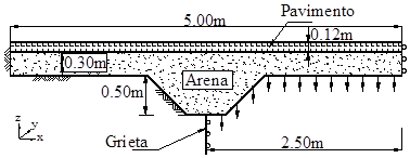 La geometría propuesta para el modelo de análisis se presenta en la Figura 3. Las dimensiones horizontales del modelo son suficientes para permitir el libre desarrollo de los asentamientos. La simulación de la formación de un escalón en la grieta consiste en imponer un desplazamiento vertical δz a la mitad del lado derecho del modelo y en restringir el desplazamiento del lado izquierdo. Se consideran desplazamientos verticales δz en la grieta de 0.1, 0.2 y 0.3 m.