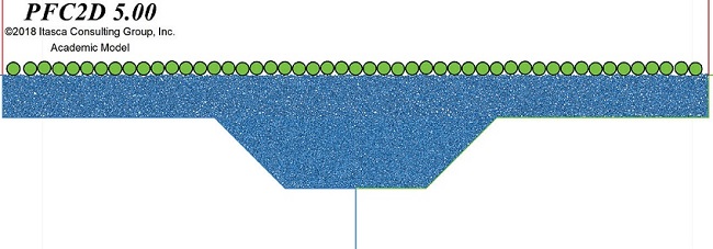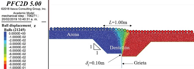 Para simular el problema de interés, se seleccionan las partículas de acuerdo con una granulometría relativamente uniforme (Coeficiente de uniformidad Cu=2), se depositan por gravedad y se deja que la muestra alcance el equilibrio. Se nivela la superficie y se colocan las partículas que representan el pavimento (Figura 4). Posteriormente, para simular un incremento en el escalón de la grieta, el lado derecho del modelo se desplaza hacia abajo hasta un valor δz dado. La velocidad del desplazamiento es muy baja para evitar efectos de inercia.