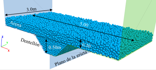 El método de elementos discretos (Cundall y Strack, 1979), DEM por sus siglas en inglés, permite simular la interacción mecánica entre un conjunto de partículas independientes, de acuerdo con un modelo reológico de contacto. En el caso de las arenas, las fuerzas de interacción en los contactos entre granos se rigen por la fricción en su superficie. Las partículas se representan por discos o esferas rígidos, con una densidad ρ= 2600 kg/m3 y un coeficiente de fricción μ = 0.7 (equivalente a un ángulo de fricción interparticular ϕμ = 35 °). Se realizan simulaciones bidimensionales (2D) y tridimensionales (3D).