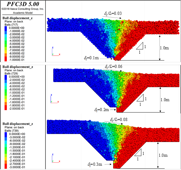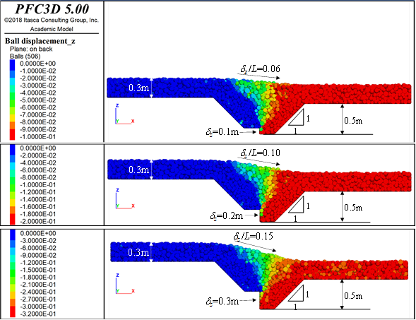 Se observa también que, en la mayor parte del modelo, las partículas conservan sus posiciones relativas. En el lado alto de la grieta, las partículas permanecen estáticas (δz = 0) y en el lado bajo casi todas las partículas bajan junto con la frontera móvil que las subyace (δz = 0.1 m).