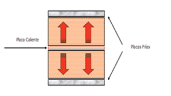 Análisis de conductividad térmica: La medición de conductividad térmica del material compuesto se llevó a cabo en un equipo de placa caliente asilada, con base en la norma ASTM-C177 (ASTM International, 1997), con un intervalo de temperatura de 100-150 °C. El material se sometió a una diferencia de temperatura, la relación del flujo de calor se basó en la exposición del material en contacto directo con las superficies en una placa caliente y placa fría, monitoreados por termopares en puntos específicos del material compuesto, las temperaturas a las que fueron sometidos los materiales obtenidos se mantuvieron en un intervalo de 80 a 150 °C en la placa caliente, mientras que la temperatura en la placa fría se mantuvo a una temperatura controlada entre 10 y 20 °C. El esquema del proceso de medición de la conductividad térmica se muestra en la Figura 1.
