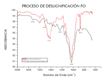 En los resultados obtenidos, se observan señales en el intervalo de 1750 cm-1 a 1700 cm-1 y de 1550 cm-1 a 1500 cm-1, con una disminución de intensidad de la señal en el proceso de blanqueo, indicando un estiramiento asimétrico de C-O-C, correspondiente a un desprendimiento de lignina y hemicelulosa en la FO (Pereira et al., 2011; Nuruddin et al., 2011); la señal presente entre 1450 cm-1 y 1400 cm-1, corresponde a la deformación de CH2 de la celulosa en la FO (Saelee et al., 2014; Vera et al., 2014b), la desaparición de la señal en el intervalo que va de 1250 cm-1 a 1200 cm-1, también indica una separación de lignina y hemicelulosa de la FO (Saelee et al., 2014; Velez et al., 2014), la disminución de la señal entre 1100 cm-1 y 1000 cm-1 indica un movimiento de estiramiento de C-O y O-H de celulosa presente en la FO (Vera et al., 2014b; Marwah et al., 2014), el aumento de señal presente en el intervalo de 900 cm-1 a 850 cm-1, es el correspondiente al anillo de glucosa en la celulosa de la FO tratada (Saelee et al., 2014; Vera et al., 2014b). Estos resultados muestran que gran parte de la estructura básica de la FO se modificó, particularmente la eliminación de lignina y hemicelulosa, dejando expuesta en su mayoría micro fibrillas de celulosa, por otra parte, después del proceso de deslignificación con el tratamiento de NaOH, la microfibrilla resistirá el ataque alcalino generado en la matriz por la combinación de CPC-30R y agua, con el propósito de no afectar sus propiedades destinadas a evitar la generación de fisuras en el cemento fresco o en el proceso de fraguado del material.