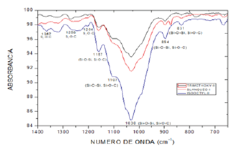 Posteriormente se analizaron las FO modificadas superficialmente mediante análisis de espectrofotometría de FTIR para identificar la interacción química de los enlaces Si-O-Si, así como Si-O-C, elementos fundamentales de la modificación superficial generada en la modificación entre la micro fibrilla de celulosa y silano, mediante el análisis se observaron las señales que se muestran en la Figura 4.