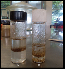 Análisis hidrofóbico de la FO en un sistema agua-tolueno: Se realizó una prueba de afinidad al agua de las muestras de FO, se colocaron 0.5 g de bagazo de caña modificada con el proceso de deslignificación y silanización, en una mezcla de agua/tolueno a 50 % V/V, observando el comportamiento de las fibras en un medio acuoso (Salgado et al., 2010).