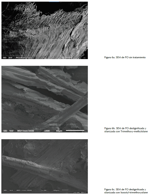 En la Figura 6a se muestra la micrografía obtenida mediante SEM de FO natural, en ella no se observan las FO libres y limpias; en la Figura 6b se muestra la micrografía de la FO con tratamiento de deslignificación y silanización con Trimethoxy-methylsilane, mientras que en la Figura 6c, se muestra una FO con tratamiento de deslignificación y silanización con Isooctyl-trimethoxysilane, en ambas se aprecia una superficie lisa y libre de residuos, indicando un eficiente proceso de remoción de lignina y hemicelulosa, dejando expuesta una superficie de celulosa y un recubrimiento creado por la modificación superficial química de la FO y el silano, con ello se corrobora la modificación superficial sobre FO. También mediante el análisis EDS como se muestra en la Figura 7, se verificaron los elementos esenciales de la interacción química Si-O-C producida por los tratamientos realizados.