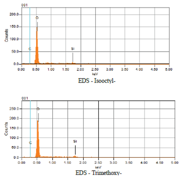 Las señales obtenidas mediante FTIR, indicaron la interacción química de la FO y el silano, en las señales presentes en el intervalo de 1400 cm-1 a 800 cm-1 están relacionadas a la interacción entre los grupos polisiloxano Si-O-Si sobre la superficie de la FO, destacadas por una señal con una mayor frecuencia correspondiente a la interacción del silano Isooctyl-trimethoxysilane en comparación con el silano Trimethoxy-methylsilane; así mismo las señales presentes entre 1400 cm-1 y 1200 cm-1 corresponden a la interacción química de los grupos polisiloxano con el carbono de la estructura química de celulosa presente en la FO, destacando los elementos de silano y celulosa (Si-O-C), haciéndose evidente un aumento de la intensidad de la señal y su amplitud, correspondiente a la interacción del silano Isooctyl-trimethoxysilane en comparación con el silano Trimethoxy-methylsilane (Velez et al., 2014; Zhou et al., 2014; Vega et al., 2010). Estos análisis muestran una mejor interacción con el Isooctyl-trimethoxysilane, aunque también evidencia la adhesión de Trimethoxy-methylsilane, asimismo, permite afirmar la formación de una capa de polisiloxano en toda la superficie de la FO mediante la interacción química de la micro fibrilla de celulosa y silano, este último ha sido considerado como un elemento principal de los productos de impermeabilización en el mercado. Este análisis permite considerar que la modificación superficial realizada a la FO, dará como resultado una fibra con característica hidrofóbica.
