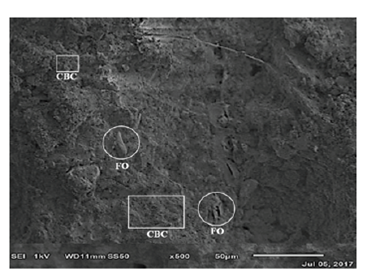 En la Figura 8, se muestra la micrografía del material compuesto de CPC-30R/CBC/FO, se observa principalmente la interacción de los materiales de refuerzo, por una parte, el agregado fino de CBC y como segundo refuerzo la FO, las características principales a resaltar es la buena adherencia de estos materiales en la matriz de CPC-30R, así como la nula porosidad generada en la interface de la FO y la matriz. Es importante destacar que no se aprecian variaciones volumétricas en la FO silanizada, evitando así la generación de espacios huecos y una superficie porosa en el material que afecte su resistencia al ser expuesto a altas temperaturas y la generación de fisuras. En la micrografía se observa que los materiales de refuerzo se encuentran embebidos en un material continuo correspondiente a la matriz de cemento, lo cual nos indica una buena interacción entre ellos debida a la unión mecánica generada en la interface de los materiales.