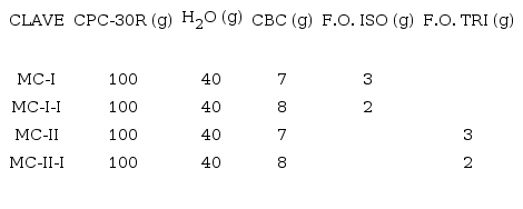 Se elaboró un material compuesto con una relación agua/cemento de 0.40 en peso, considerando los valores óptimos de resistencia y durabilidad (Suiza, 1978). Para contrarrestar la porosidad de la matriz se utilizó un agregado fino de CBC con una granulometría M-100 por sus características morfológicas. Por otra parte, se agregó FO modificada superficialmente, como refuerzo del material en función de su resistencia mecánica. Los elementos de refuerzo corresponden a un 10 % del peso del CPC-30R, esta relación y la variación de las cantidades de cada uno de los elementos del material compuesto se definió experimentalmente cuidando no incrementar la porosidad del mismo, la relación de los materiales se muestran en la Tabla 1.