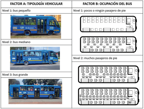 El arreglo factorial para el diseño del tratamiento consistió en dos factores cualitativos, factor A “tipología vehicular” con tres niveles a = 3 (bus pequeño, bus mediano y bus grande) y factor B “ocupación del bus” antes de abrir puertas con dos niveles b = 2 (pocos o ningún pasajero de pie y muchos pasajeros de pie). Los niveles de cada factor fueron seleccionados de acuerdo a lo mostrado en la Figura 1.
