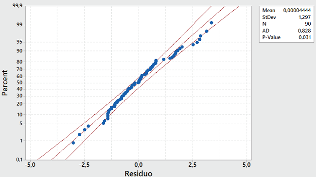En contraste con el análisis de los residuales estandarizados, la gráfica de probabilidad normal de los residuales mostrada en la Figura 2, revela que los datos no siguen una distribución normal, en primer lugar porque todos los puntos no están cubiertos por la banda formada en la gráfica, y en segundo, el valor de p está por debajo de 0.05.