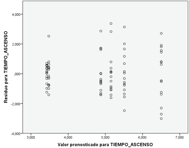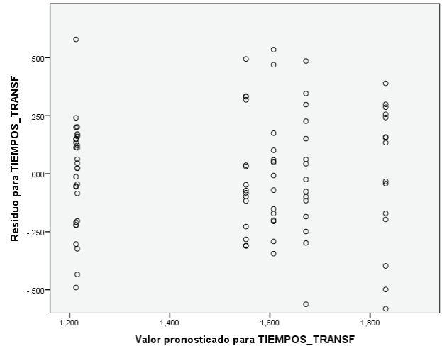 En la Figura 3 se muestra la gráfica de los residuales contra los valores ajustados en donde se aprecia una tendencia de la varianza de los residuales a incrementarse cuando el tiempo de ascenso por pasajero aumenta. Los residuales se encuentran con una estructura obvia y una varianza no constante, que crece en forma de embudo con la boca hacia afuera, lo cual confirma que los datos no siguen una distribución normal. Dado que no se cumplen los supuestos del modelo, el enfoque más recomendado para abordar el problema cuando la varianza no es constante es aplicar una transformación de datos para estabilizar la varianza (Kuehl,2001; Montgomery, 2013).