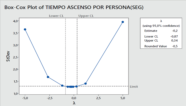 Se encontró que los datos de tiempos de ascenso por pasajero recolectados no siguen una distribución normal, y en concordancia con lo descrito inicialmente, involucrar aspectos como la ocupación del bus puede hacer más complejo el análisis de la operación del transporte público. El mejor ajuste o transformación de los datos encontrado a través del método Box-Cox fue utilizar el recíproco de la raíz cuadrada con λ= -0.05. La transformación efectuada permitió estabilizar la varianza de los datos, una distribución normal de la variable respuesta y mejoró en definitiva el ajuste del modelo a los datos.