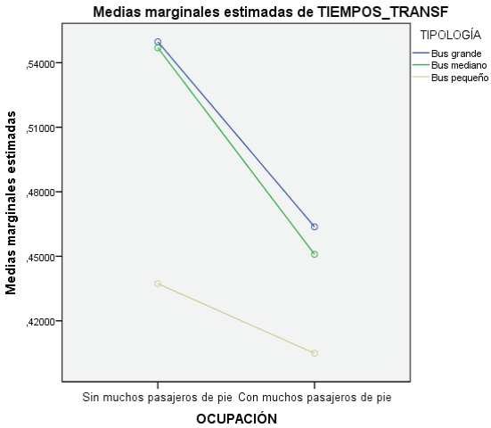 Para entender mejor que los efectos de cada factor transformado son significativos, en la Figura 5 se muestran las respuestas promedio para cada combinación de los tratamientos. Aunque la interacción no es significativa, y por tanto las rectas no se cruzan entre sí, se observa que para ocupaciones bajas y altas del bus, el valor de la respuesta transformada es más baja para el bus pequeño y que los buses más grandes tienen un valor de respuesta transformado más alto.