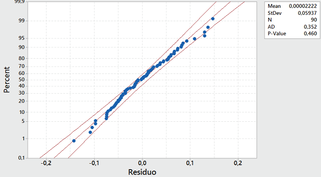 La gráfica de probabilidad normal mostrada en la Figura 6, para esta ocasión con los residuales obtenidos a partir de los datos transformados, revela ahora un único punto por fuera de la banda formada en la gráfica (antes eran seis), y el valor de p es superior a 0.05 lo que indica una distribución normal de los datos.