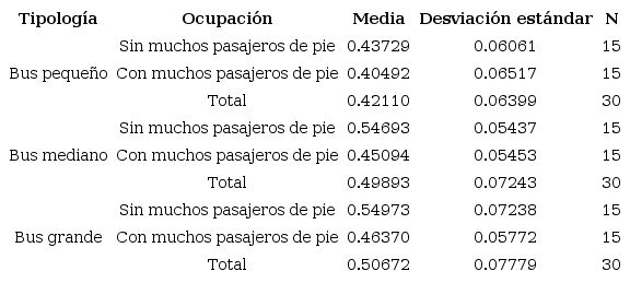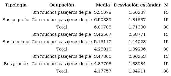 En la Tabla 2 se muestran los estadísticos descriptivos para cada unidad experimental definida. Una evaluación preliminar de las medias indica un aumento de los tiempos de ascenso por pasajero, a medida que disminuye el tamaño del bus y a medida que aumenta la ocupación del mismo. La desviación estándar parece ser más alta cuando aumenta el número de pasajeros al interior del bus.