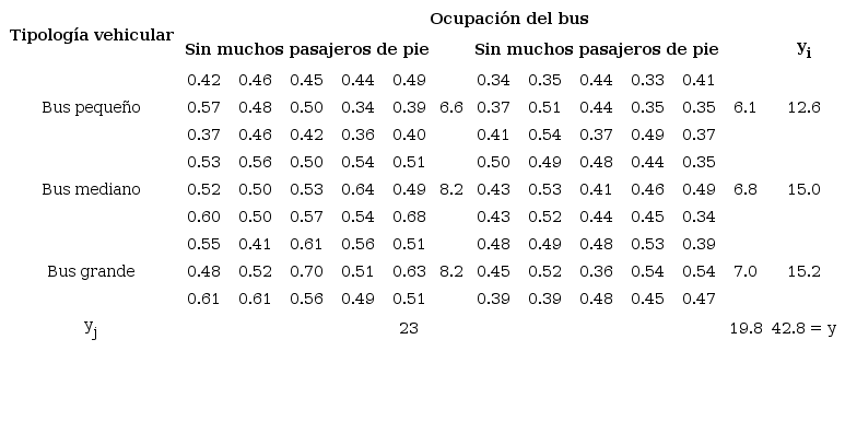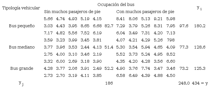 Se seleccionaron de manera aleatoria n = 15 réplicas por unidad experimental para un total de a × b × n = 90 observaciones a trabajar en el experimento. De cada una, se calculó el tiempo individual de ascenso por pasajero como el cociente entre el tiempo de parada y el número de usuarios que subieron al bus. Los datos a analizar se muestran en la Tabla 1. Los totales de los renglones y las columnas se indican en los márgenes de la tabla y a la derecha de cada celda los totales de cada una.