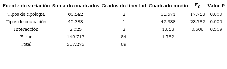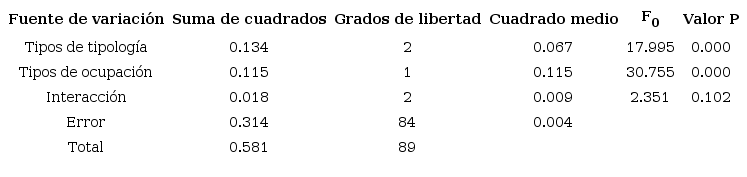 En la Tabla 6 se muestra el ANOVA resultante de los datos transformados del estudio en cuestión. Dado que F0.05, 2.84 =3.12 > 2.351 se concluye que no existe interacción significativa entre la tipología y la ocupación, es decir, se rechaza la hipótesis alternativa planteada en (4). Por su parte, como F0.05, 2.84 = 3.12 < 17.995 y F0.05, 1.84 = 3.97 < 30.755 se concluye que los efectos principales de la tipología y la ocupación en sus valores transformados son significativos, esto es, se rechaza la hipótesis nula planteada en (2) y (3).