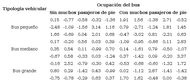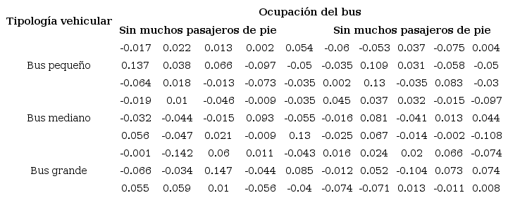 Siendo, f número de grados de libertad asociados al MSE-. Las comparaciones por pares dan como resultado los valores mostrados en la Tabla 7. Aquellos que son superiores a T0.05 son los que presentan diferencias significativas. Para bajos niveles de ocupación, el tiempo de ascenso por persona (transformado) no es significativamente diferente para bus grande y mediano, mientras que es significativamente inferior cuando se realiza en un bus pequeño en comparación con el bus grande y mediano. Para niveles de ocupación altos, es solo significativamente inferior cuando ocurre en bus pequeño comparado con bus grande.